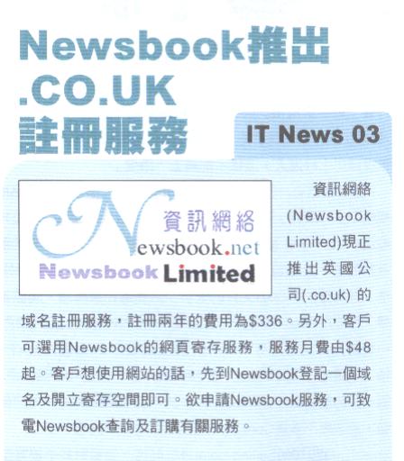 Newsbook business for many years and have experience in senior services providing clients with comprehensive commercial and personal Internet services, in terms of quality of service and attitude are constantly strive to enrich it is trustworthy. Would you like to establish a web site, first register a Newsbook domain name and open storage space for it! Please contact Newsbook ordering inquiries and Newsbook ─ related services Tel: 2782 0197, e-mail: info@newsbook.net, Web site: http://www.newsbook.net.