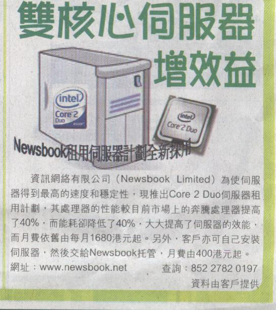 In addition, customers can also install their own server, and then hosting to Newsbook, a monthly fee starting from HK$400. Newsbook has different server services, there must be one fits you. Such as shared, do not have hesitate, please order as soon as possible. Would like to know more details of the server services in Newsbook, please visit Newsbook site: www.newsbook.net, or call Newsbook 2782-0197 / e-mail to info@newsbook.net inquiries.