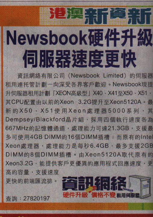 Newsbook upgrade the server rental scheme once again, launched a new server rental plan in Hong Kong, comprehensive increased memory capacity, it’s double of the original plan, rather than raise the rental prices, customers could use the better server in the same price of the original plan, enjoy the server of the memory from 1GB to 8GB! In this upgrade, Newsbook made a significant innovation in B28 of the original plan, upgrade to B29 plans, the CPU upgrade to E4500 dual-core, memory up to 1GB, and hard disk is 160GB. And customers only need to pay HK $880 monthly fee, Will be able to hire an advanced server configuration, needn’t to spend a lot of money to acquire equipment. Each server will be rented for single client to use, all resources in the exclusive case, your server and the operational efficiency of the company's Web site will be great improved. Make your operation of work greater ease and comfort. Newsbook server is what you choose could not be missed.