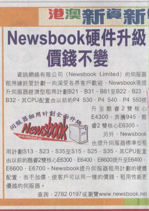 Newsbook upgrade the server rental scheme once again, launched a new server rental plan in Hong Kong, comprehensive increased memory capacity, it’s double of the original plan, rather than raise the rental prices, customers could use the better server in the same price of the original plan, enjoy the server of the memory from 1GB to 8GB! In this upgrade, Newsbook made a significant innovation in B28 of the original plan, upgrade to B29 plans, the CPU upgrade to E4500 dual-core, memory up to 1GB, and hard disk is 160GB. And customers only need to pay HK $880 monthly fee, Will be able to hire an advanced server configuration, needn’t to spend a lot of money to acquire equipment. Each server will be rented for single client to use, all resources in the exclusive case, your server and the operational efficiency of the company's Web site will be great improved. Make your operation of work greater ease and comfort. Newsbook server is what you choose could not be missed.