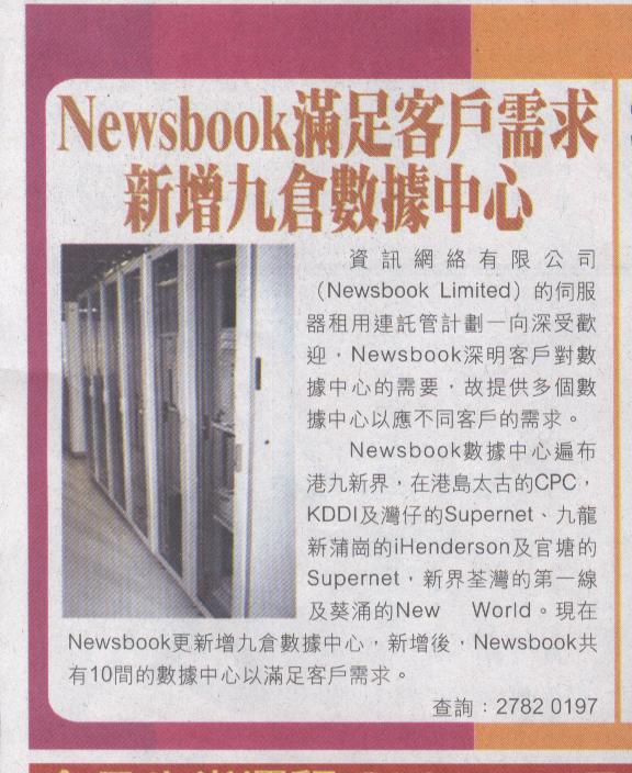 Newsbook data centers all over Hong Kong, Kowloon and New Territories, Hong Kong Island Pacific's CPC, KDDI and Wan Chai Supernet, a new Kowloon and Kwun Tong iHenderson of the Supernet, New Territories, first line in Tsuen Wan and New World in Kwai Chung. Visit speed, it depend on the client used to visit where, some data centers connect to the United States ,Canada or Europe is better, while one of it connected to the mainland is faster. Now Newsbook add new T & T (Wharf) data center, after this, Newsbook has 10 data centers to meet the needs of different customers.