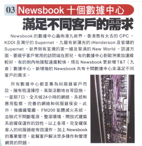 Newsbook data centers all over Hong Kong, Kowloon and New Territories, Hong Kong Island Pacific's CPC, KDDI and Wan Chai Supernet, a new Kowloon and Kwun Tong iHenderson of the Supernet, New Territories, first line in Tsuen Wan and New World in Kwai Chung. Visit speed, it depend on the client used to visit where, some data centers connect to the United States ,Canada or Europe is better, while one of it connected to the mainland is faster. Now Newsbook add new T & T (Wharf) data center, after this, Newsbook has 10 data centers to meet the needs of different customers.