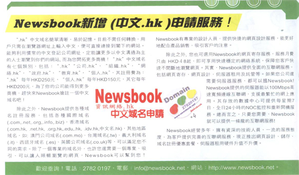 ". hk" Chinese domain name is simple and clear, easy-to-remember. At present, without any conversion, the user only inputting Chinese characters in the web site browser will be able to connect to your website directly. Take advantage of the usual Chinese Web site registration, could let the mainly using Chinese people to visit your website, and give you more opportunities to get business! Newsbook thanks for customer support, from now on, as long as the application in Newsbook by the following of these Chinese domain name: Chinese. hk / Chinese. Company. hk / Chinese. organizations. hk domain name, the first year give $ 100 back. Chinese. hk, registration fees as follows: the first year of HKD150, year after HKD250. Chinese. co. hk / Chinese. organizations. hk, first year of its registration fee is HKD100, year after is HKD200. Concessionary numbers are limited; please call as soon as possible Newsbook: 2782-0197 to register a Chinese domain name for your company, so your company can get more business opportunities.