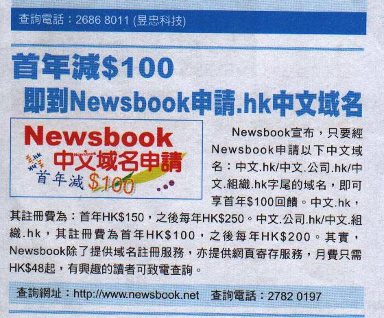 ". hk" Chinese domain name is simple and clear, easy-to-remember. At present, without any conversion, the user only inputting Chinese characters in the web site browser will be able to connect to your website directly. Take advantage of the usual Chinese Web site registration, could let the mainly using Chinese people to visit your website, and give you more opportunities to get business! Newsbook thanks for customer support, from now on, as long as the application in Newsbook by the following of these Chinese domain name: Chinese. hk / Chinese. Company. hk / Chinese. organizations. hk domain name, the first year give $ 100 back. Chinese. hk, registration fees as follows: the first year of HKD150, year after HKD250. Chinese. co. hk / Chinese. organizations. hk, first year of its registration fee is HKD100, year after is HKD200. Concessionary numbers are limited; please call as soon as possible Newsbook: 2782-0197 to register a Chinese domain name for your company, so your company can get more business opportunities.