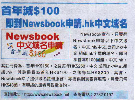 Register Domain at newsbook, first year reduce $100 HKD