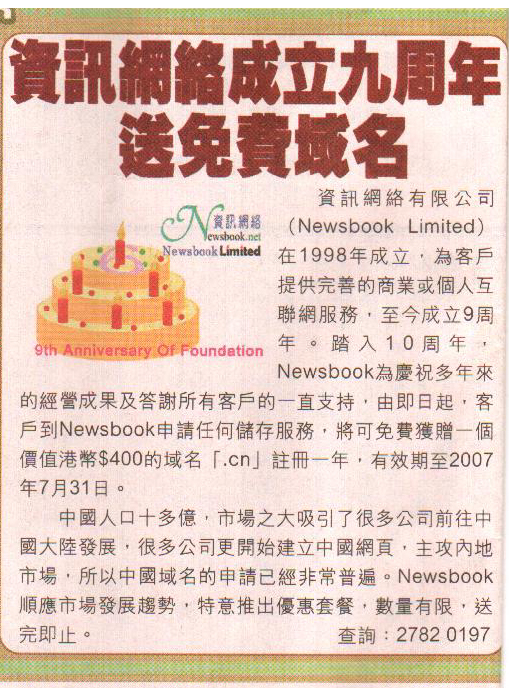 The ninth anniversary of the establishment of information network to send a free domain name Newsbook Limited (Newsbook Limited) was established in 1998 to provide clients with comprehensive commercial and personal Internet services, these has been ninth anniversary. While enter in the tenth anniversary, Newsbook to celebrate the many years of operating results and thank all of our customers support, from now on, the customer to apply for any Newsbook storage services will be offered a free value of HK $ 400 for a .Cn registration domain name in a year, the deadline of validity is July 31, 2007. |