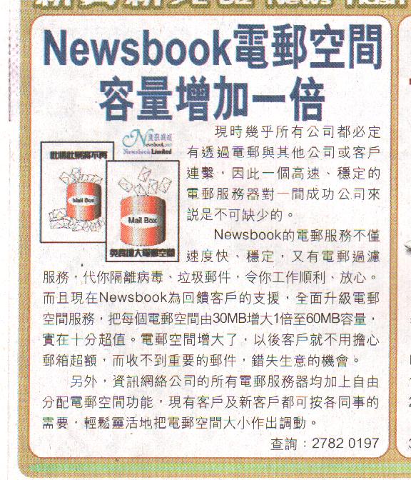 The rapid popularization of the Internet, as well as the Internet overwhelming technological innovation, take us truly entered the information period, the use of the Internet has a profound impact on every aspect of our lives. Especially in commercial applications, the effect is more significant. Now, send a letter through the traditional way has been not enough to meet the needs of information. More and more delivery information by e-mail, because e-mail not only send and receive are quick, reliable, but also easy to keep a recipient or Sent record, convenience to the search of records. Almost all companies now must communicate with other companies or customers by e-mail for business, without caring about each other in what country. Therefore a high-speed, stable e-mail server for a successful company is indispensable. Newsbook e-mail service is not only fast, stable, but also filtering the mail, on behalf of your isolation virus, spam, so smoothly in your work, set your heart in rest. Moreover Newsbook now back to clients for the supports, upgrade e-mail service space, e-mail space for each double increase from 30MB to 60MB of its capacity, E-mail space has increased, It is value! Customers no longer need to worry about Over-mail, and can not receive important messages, missed business opportunities. In addition, Newsbook for all e-mail servers with space for free distribution of functions, you could accordance with the needs of existing and new customers, easy to space the size of the e-mail for the mobilization. Free access to the above of enhanced reference services, is very convenient and meet your needs! This service upgrade, e-mail space has increased, but price is same. It’s very attractive discount! Newsbook e-mail server is the best choice for you. Apply for an account quickly.