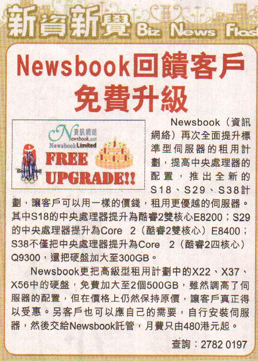 During the fitting of Server, the central processing unit(CPU) is extremely important components, it is the core of the whole server. Because all kind of the work have to rely on the CPU, such as all computing, control, logic treatment job. So the faster CPU, the higher efficiency of the server. And upgrading the CPU is very quick. Newsbook enhance the standard server rental plan again , improve the configuration of the CPU, provide the new plan:S18, S29, S38. Whereby customers can use the same price, the lease of more excellent server. The Plan of S18 which CPU upgraded to (Core 2 Duo dual-core) E8200, The plan of S29 which CPU upgrade to Core 2 (Core 2 Duo Core) E8400,The plan of S38 which CPU upgrade to Core 2 (four-core Core 2 Duo ) Q9300 and increase the hardware to 300G.At the same time, Newsbook free increase the capacity of hard disk to two 500G to the advanced rental service plan: (X22、X37、X56) according to the needs of clients. During the planned upgrade of the server, Although Newsbook increase in the server configuration, remained at the original price. So that customers can really benefit. All client have been installed the server with their needs, and then hosting at Newsbook, Only a monthly fee starting from HKD$480.