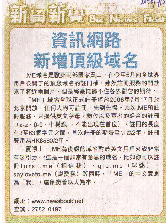In addition, customers registrate domain name, moreover could storage Asian Domain Name in the Newsbook, services by a monthly fee from HK $ 48 on. Through real-timemirroring of Newsbook, broad peer-to-peer networks among Hong Kong, other country which nearby the Asia and the United States Internet Exchange Points (IXPs) data center, your customers can visit your web page in speed, helping your business development and publicity. Newsbook web storage services are stability,help your company establish a good image and give customers confidence. Newsbook business for many years, have excellent service experienced, to provide customers with comprehensive business Internet services, in terms of quality of service and attitude are constantly strive to enrich it is trustworthy.