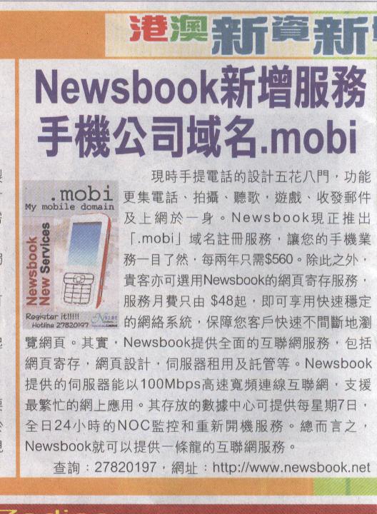 Today, new style mobile phone is colorful, different kinds design in hardware and software. It’s function including making a call, videos, listening the radio, MP3 player, play games, send and receive e-mail, browse Internet, and mobile web site continue to improve. For the majority of mobile phone users, we provide the best quality of service. A growing number of companies are engaged in this kind of service-related, but how to make your customers more quickly query to your company? Newsbook is introduced. mobi domain name registration service, which will allow you phone business at a glance, the price of two years, only HKD560, Come Newsbook to apply. mobi mobile domain name!