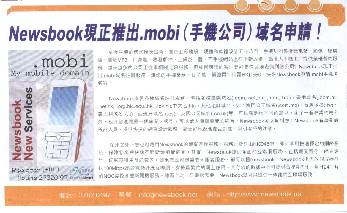 Today, new style mobile phone is colorful, different kinds design in hardware and software. It’s function including making a call, videos, listening the radio, MP3 player, play games, send and receive e-mail, browse Internet, and mobile web site continue to improve. For the majority of mobile phone users, we provide the best quality of service. A growing number of companies are engaged in this kind of service-related, but how to make your customers more quickly query to your company? Newsbook is introduced. mobi domain name registration service, which will allow you phone business at a glance, the price of two years, only HKD560, Come Newsbook to apply. mobi mobile domain name!
