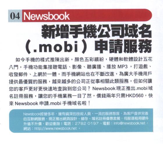 Today, new style mobile phone is colorful, different kinds design in hardware and software. It’s function including making a call, videos, listening the radio, MP3 player, play games, send and receive e-mail, browse Internet, and mobile web site continue to improve. For the majority of mobile phone users, we provide the best quality of service. A growing number of companies are engaged in this kind of service-related, but how to make your customers more quickly query to your company? Newsbook is introduced. mobi domain name registration service, which will allow you phone business at a glance, the price of two years, only HKD560, Come Newsbook to apply. mobi mobile domain name!