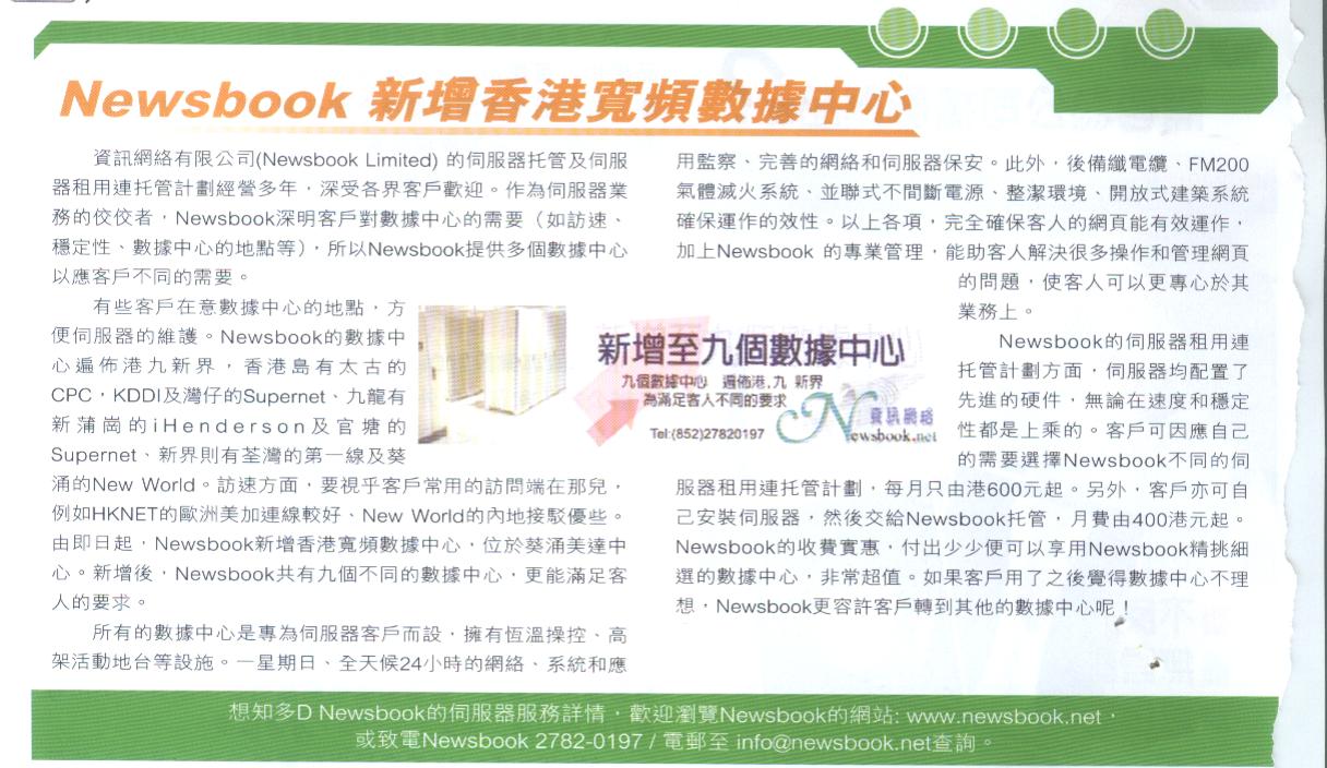 Newsbook data centers all over Hong Kong, Kowloon and New Territories, Hong Kong Island Pacific's CPC, KDDI and Wan Chai Supernet, a new Kowloon and Kwun Tong iHenderson of the Supernet, New Territories, first line in Tsuen Wan and New World in Kwai Chung. Visit speed, it depend on the client used to visit where, some data centers connect to the United States ,Canada or Europe is better, while one of it connected to the mainland is faster. Now Newsbook add new T & T (Wharf) data center, after this, Newsbook has 10 data centers to meet the needs of different customers.
