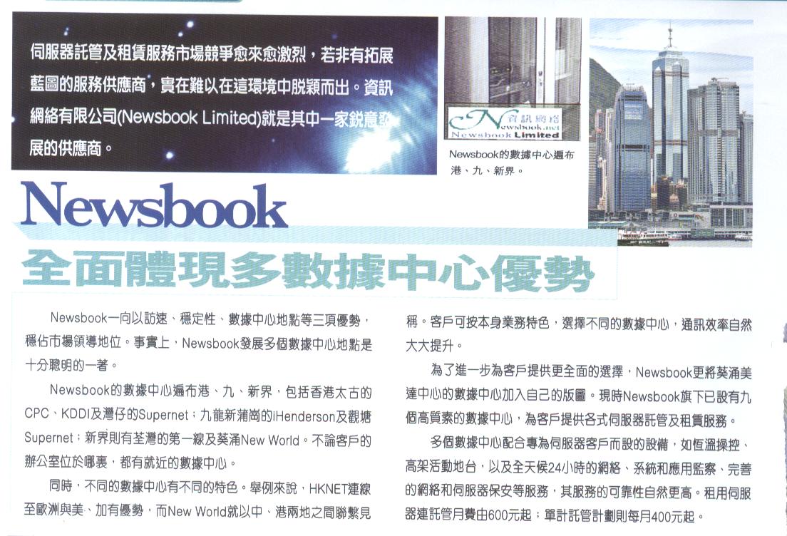 Newsbook data centers all over Hong Kong, Kowloon and New Territories, Hong Kong Island Pacific's CPC, KDDI and Wan Chai Supernet, a new Kowloon and Kwun Tong iHenderson of the Supernet, New Territories, first line in Tsuen Wan and New World in Kwai Chung. Visit speed, it depend on the client used to visit where, some data centers connect to the United States ,Canada or Europe is better, while one of it connected to the mainland is faster. Now Newsbook add new T & T (Wharf) data center, after this, Newsbook has 10 data centers to meet the needs of different customers.