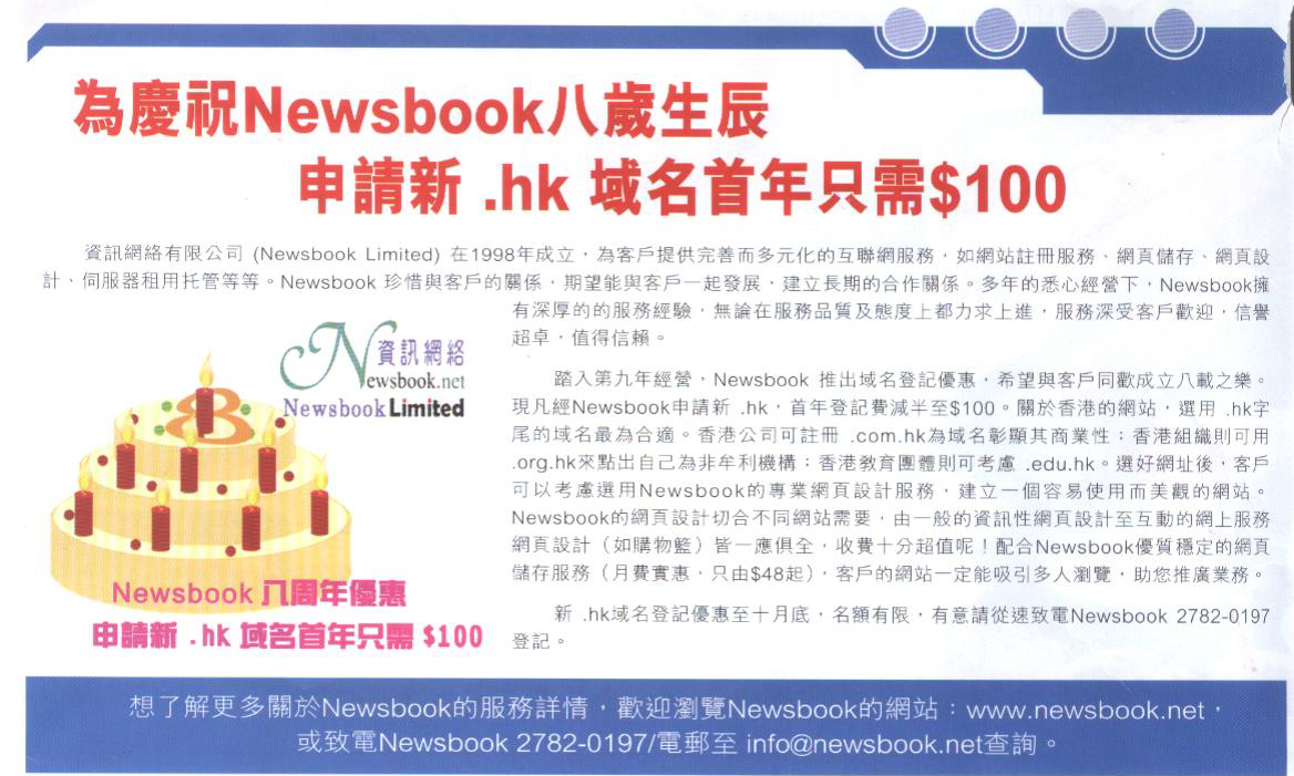 Into the operation of the ninth, Newsbook launch discount of domain name registration, to celebrate the joy of the 8th anniversary with customer, Newsbook new applications in domain name. Hk, the first year of registration fees discount by half to HK$ 100. On the Web site of Hong Kong, choose. Hk domain name is most appropriate. Hong Kong companies can be registered. Com.hk domain name of their business for demonstrated; Hong Kong organizations available in the. Org.hk to point out their own non-profit-making institutions; educational bodies in Hong Kong could be considered. Edu.hk. After make a decision of web site, customers can consider Newsbook professional web design services, establish an easy-to-use and attractive website. Newsbook web design to meet the needs of different sites, from general information to the interactive nature of web page design web design web-based services (such as shopping baskets) are readily available, fees are very value! Stability with high-quality website of Newsbook storage services (monthly fee just only from HK$ 48), the customer's Web site will attract people to browse, help your business in promoted.