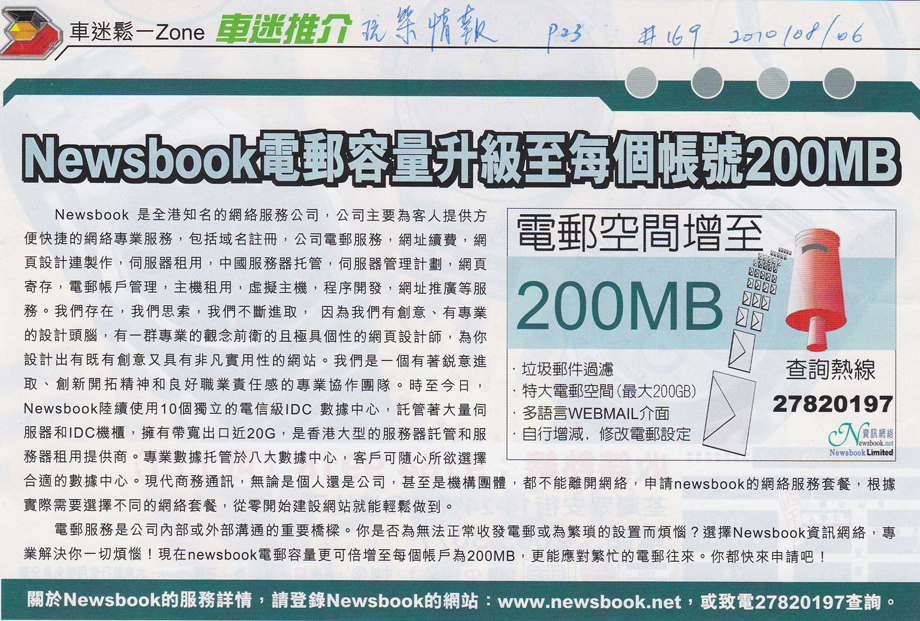 電郵服務是公司內部或外部溝通的重要橋樑。你是否為無法正常收發電郵或為繁瑣的設置而煩惱。選擇Newsbook資訊網絡, 專業解決你一切煩惱! 現在newsbook 電郵容量更可倍增至每個帳戶為200MB, 更能應對繁忙的電郵往來。