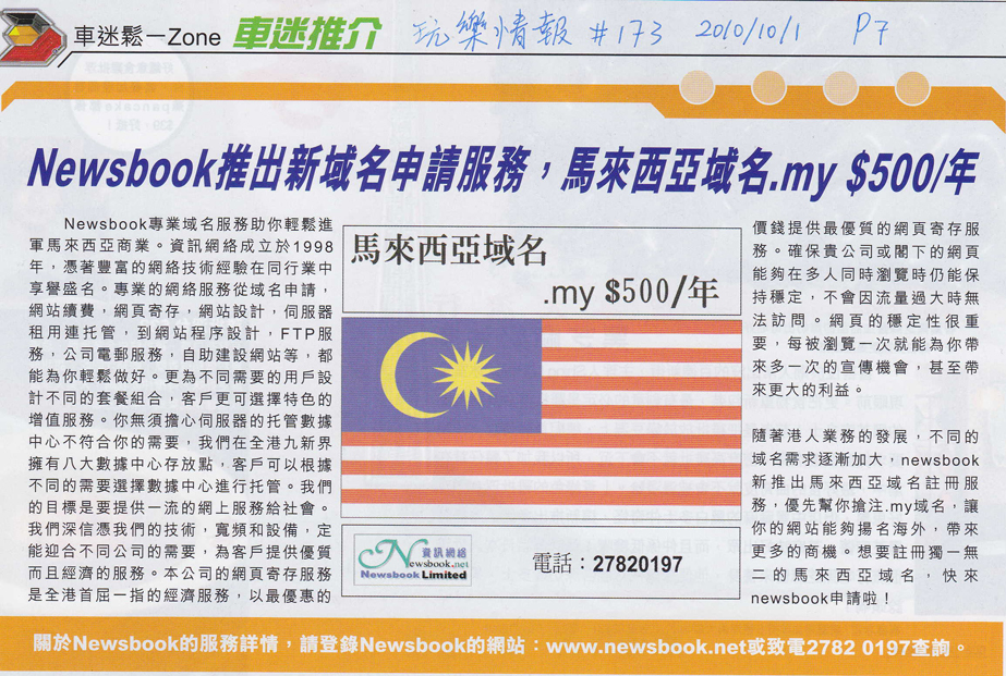 Newsbook專業域名服務助你輕鬆進軍馬來西亞商業。資訊網絡成立於1998年, 憑著豐富的網絡技術經驗在同行中享譽盛名。專業的網絡服務從域名申請, 網站續費, 網頁寄存, 網站設計, 伺服器租用連托管, 到網站程序設計, FTP服務, 公司電郵服務, 自助建設網站等, 都能為你輕鬆做好。更為不同需要的用戶設計不同的設計組合, 客戶更可選擇特色的增值服務。你無需擔心伺服器的托管數據中心不符合你的需要, 我們在全港九新界擁有八大數據中心存放點, 客戶可以根據不同的需要選擇數據中心進行托管。我們的目標是要提供一流的網上服務給社會。我們深信憑我們的技術, 寬頻和設備, 定能迎合不同公司的需要, 為客戶提供優質而且經濟的服務。本公司的網頁寄存服務是全港首屈一指的經濟服務, 以最優惠的價錢提供最優質的網頁寄存服務。確保貴公司或閣下的網頁能夠在多人同時瀏覽時仍能保持穩定, 不會因流量過大時無法訪問。網頁的穩定性很重要, 每被瀏覽一次就能為你帶來多一次的宣傳機會, 甚至帶來更大的利益。