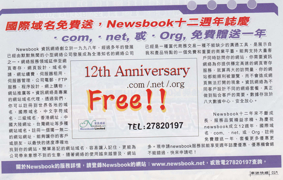 Newsbook十二年來不斷成長, 服務品質精益求精。為慶祝newsbook成立12週年, 國際域名.com, .net, 或 .Org, 註冊免費贈送一年, 套餐更多優惠更多。現申請newsbook服務就能享受週年誌慶優惠, 優惠機會絕不可錯過, 快來申請吧!
