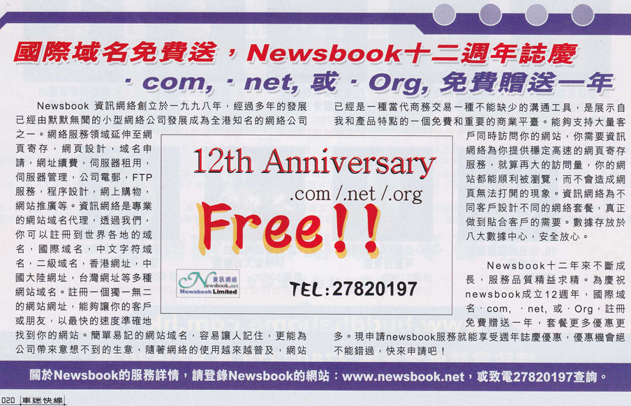 Newsbook十二年來不斷成長, 服務品質精益求精。為慶祝newsbook成立12週年, 國際域名.com, .net, 或 .Org, 註冊免費贈送一年, 套餐更多優惠更多。現申請newsbook服務就能享受週年誌慶優惠, 優惠機會絕不可錯過, 快來申請吧!