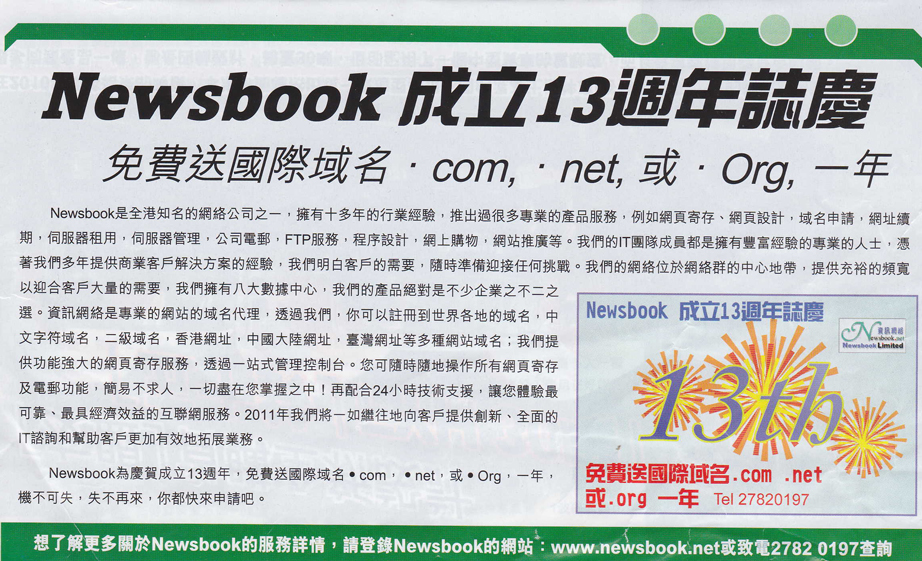 Newsbook為慶賀成立13週年,免費送國際域名 .com, .net, 或.Org, 一年,機不可失,失不再來,你都快來申請吧。