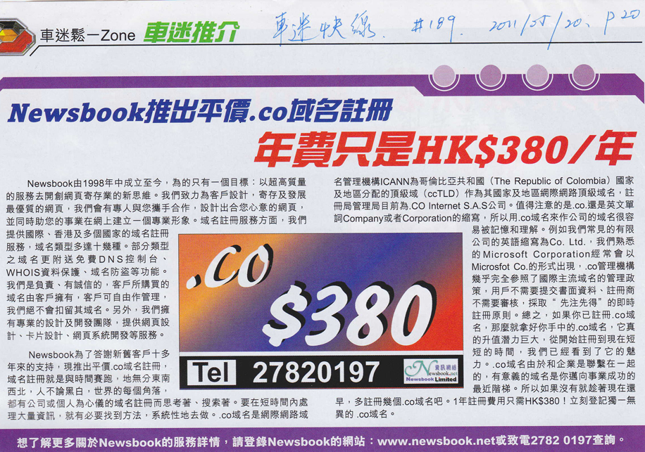 Newsbook為了答謝新舊客戶十多年來的支持, 現推出平價.co域名註冊, 域名註冊就是與時間賽跑, 地無分東南西北, 人不論黑白, 世界的每個角落, 都有公司或個人為心儀的域名而思考著、搜索著。要在短時間內處理大量資訊, 就有必要找到方法, 系統性地去做。.co域名是國際網絡域名管理機構ICANN為哥倫比亞共和國(The Republic of Colombia).國家及地區分配的超級域(ccTLD)作為其國家及地區國際網路頂級域名, 註冊局管理局目前為.CO Internet S.A.S公司。值得注意的是.co還是英文單詞Company或Corporation的縮寫, 所以用.co域名來作公司的域名很容易被記憶和理解。例如我們常見的有限公司的英語縮寫為Co. Ltd, 我們熟悉的Microsoft Corporation經常會以Microsoft Co.的形式出現, .co管理機構幾乎完全參照了國際主流域名的管理政策, 用戶不需要提交書面資料、註冊商不需要審核, 採取''先註先得''的即時註冊原則。總之, 如果你已註冊.co域名, 那麼就拿好你手中的.co域名, 它真的升值潛力巨大, 從開始註冊到現在短短的時間, 我們已經看到了它的魅力。.co域名由於和企業是聯繫在一起的, 有意義的域名是你邁向事業成功的最近階梯。所以如果沒有就趁著現在還早, 多註冊幾個.co域名吧! 1年註冊費用只HK$380! 立即登記獨一無二的.co域名。