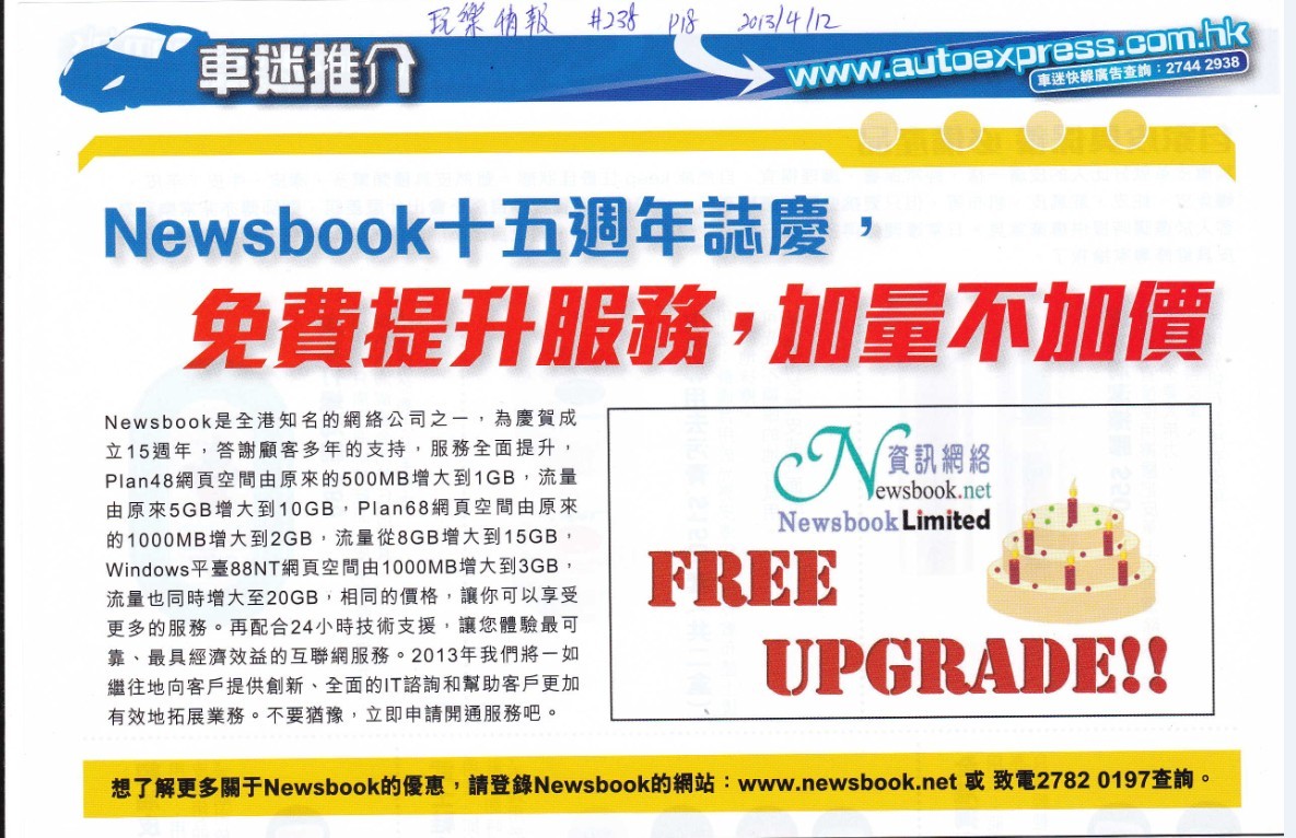 Newsbook¬O¥þ´äª¾¦Wªººôµ¸¤½¥q¤§³ü¡A¬°¼y¶P¦¨¥ß15¶g¦~¡AµªÁÂÅU«È¦h¦~ªº¤ä«ù¡AªA°È¥þ±´£¤É¡APlan48ºô¶ªÅ¶¡¥Ñì¨Óªº500MB¼W¤j¨ì1GB,¬y¶q¥Ñì¨Ó5GB¼W¤j¨ì10GB,Plan68ºô¶ªÅ¶¡¥Ñì¨Óªº1000MB¼W¤j¨ì2GB,¬y¶q±q8GB¼W¤j¨ì15GB, Windows¥»O88NTºô¶ªÅ¶¡¥Ñ1000MB¼W¤j¨ì3GB,¬y¶q¤]¦P®É¼W¤j¦Ü20GB,¬Û¦Pªº»ù®æ¡AÅý©p¥i¥H¨É¨ü§ó¦hªºªA°È¡C¦A°t¦X 24 ¤p®É§Þ³N¤ä´©¡AÅý±zÅéÅç³Ì¥i¾a¡B³Ì¨ã¸gÀٮįqªº¤¬ÁpºôªA°È¡C2013¦~§Ú̱N³ü¦pÄ~©¹¦a¦V«È¤á´£¨Ñ³Ð·s¡B¥þ±ªºIT¿Ô¸ß©MÀ°§U«È¤á§ó¥[¦³®Ä¦a©Ý®i·~°È¡C¤£nµS¿Ý¡A¥ß§Y¥Ó½Ð¶}³qªA°È§a¡C