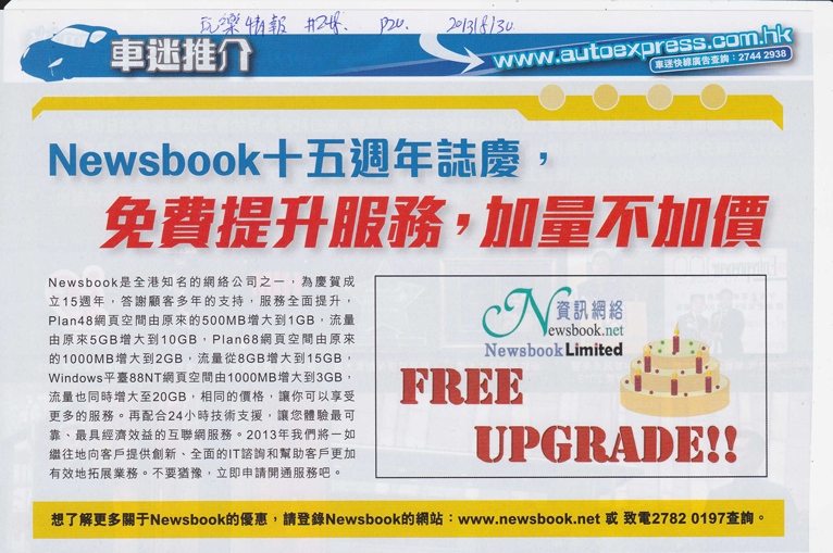 Newsbook十五週年誌慶,免費提升服務,加量不加價Newsbook是全港知名的網絡公司之一,為慶賀成立15週年,答謝顧客多年的支持,服務全面提升,Plan48網頁空間由原來的500MB增大到1GB,流量由原來5GB增大到10GB,Plan68網頁空間由原來的1000MB增大到2GB,流量從8GB增大到15GB, Windows平台88NT網頁空間由1000MB增大到3GB,流量也同時增大至20GB,相同的價格,讓你可以享受更多的服務。再配合24 小時技術支援,讓您體驗最可靠、最具經濟效益的互聯網服務。 2013年我們將一如繼往地向客戶提供創新、全面的IT諮詢和幫助客戶更加有效地拓展業務。不要猶豫,立即申請開通服務吧。 想了解更多關於Newsbook的優惠,請登錄Newsbook的網站: www.newsbook.net或致電2782 0197查詢。