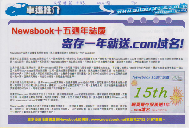 Newsbook十五週年誌慶,免費提升服務加量不加價Newsbook是全港知名的網絡公司之一,為慶賀成立15週年,答謝顧客多年的支持,服務全面提升,Plan48網頁空間由原來的500MB增大到1GB,流量由原來5GB增大到10GB,Plan68網頁空間由原來的1000MB增大到2GB,流量從8GB增大到15GB, Windows平台88NT網頁空間由1000MB增大到3GB,流量也同時增大至20GB,相同的價格,讓你可以享受更多的服務。再配合24 小時技術支援,讓您體驗最可靠、最具經濟效益的互聯網服務。 2013年我們將一如繼往地向客戶提供創新、全面的IT諮詢和幫助客戶更加有效地拓展業務。不要猶豫,立即申請開通服務吧。 想了解更多關於Newsbook的優惠,請登錄Newsbook的網站: www.newsbook.net或致電2782 0197查詢。