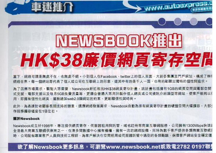 為了因應市場需求,緊貼大眾需要,Newsbook新近推出HK$38網頁寄存計畫,該計畫包括擁有1GB的網頁空間與電郵空間,CGI程式支援、電郵支援以及每月5GB免費流量等,更適合普通大眾用於製作個人網頁或公司資訊介紹類型等網站,使客戶能夠以低廉的費用,即擁有個性化網頁,擺脫諸如web2.0類網站的約束,更彰顯個性與時尚。