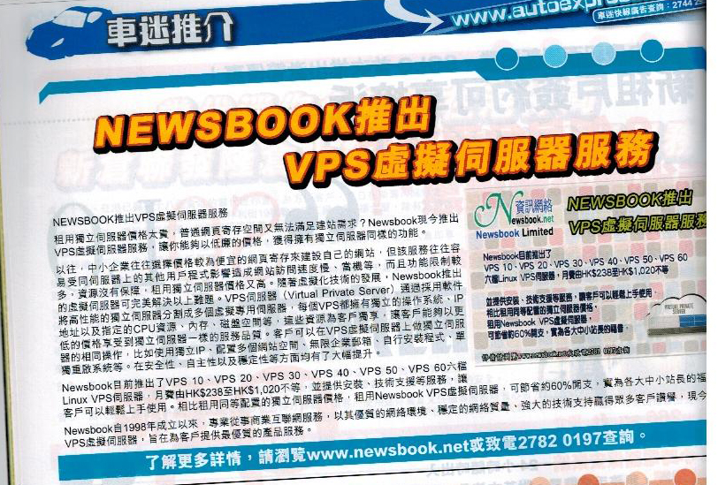 Newsbook目前推出了VPS 10、VPS 20、VPS 30、VPS 40、VPS 50、VPS 60六檔Linux VPS伺服器,月費由HK$238至HK$1,020不等,並提供安裝、技術支援等服務,讓客戶可以輕鬆上手使用。相比租用同等配置的獨立伺服器價格,租用Newsbook VPS虛擬伺服器,可節省約60%開支,實為各大中小站長的福音。 |