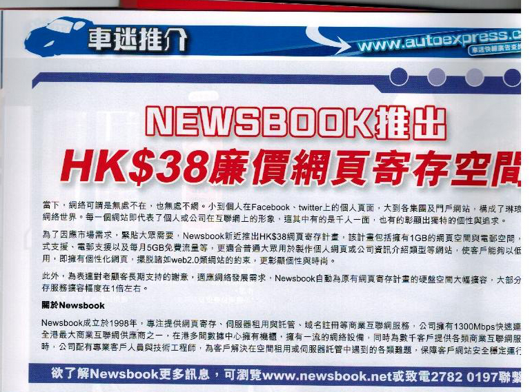 為了因應市場需求,緊貼大眾需要,Newsbook新近推出HK$38網頁寄存計畫,該計畫包括擁有1GB的網頁空間與電郵空間,CGI程式支援、電郵支援以及每月5GB免費流量等,更適合普通大眾用於製作個人網頁或公司資訊介紹類型等網站,使客戶能夠以低廉的費用,即擁有個性化網頁,擺脫諸如web2.0類網站的約束,更彰顯個性與時尚。