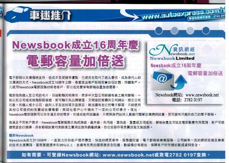 為了因應市場需求,緊貼大眾需要,Newsbook新近推出HK$38網頁寄存計畫,該計畫包括擁有1GB的網頁空間與電郵空間,CGI程式支援、電郵支援以及每月5GB免費流量等,更適合普通大眾用於製作個人網頁或公司資訊介紹類型等網站,使客戶能夠以低廉的費用,即擁有個性化網頁,擺脫諸如web2.0類網站的約束,更彰顯個性與時尚。