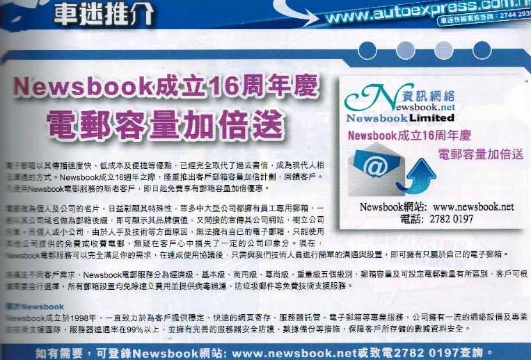 為滿足不同客戶需求,Newsbook電郵服務分為经济級、基本级、商用级、尊尚级、重量级五個級別,郵箱容量及可設定電郵數量有所區別,客戶可根據需要自行選擇,所有郵箱設置均免除建立費用並提供病毒過濾、防垃圾郵件等免費技術支援服務。如有需要,可登錄Newsbook網站: www.newsbook.net或致電2782 0197查詢。 |
