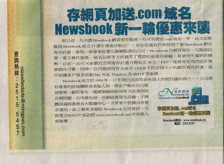 即日起,凡申請Newsbook網頁寄存服務,均可免費送.com域名一年。此次活動做為Newsbook成立17週年優惠活動之一,旨在促進客戶更好的了解Newsbook網頁寄存計畫。做為一家專業從事互聯網服務的公司,Newsbook在網頁寄存、伺服器託管、電子郵件服務、域名註冊等方面積累了豐富的資源與經驗,有著得天獨厚的優勢。目前,公司1GB網頁空間寄存計畫月費低至38元,FTP、電郵等常用功能亦無需額外付費。同時,公司還提供有2GB至150GB不同空間大小的網頁寄存計畫,並可根據客戶需求添配My SQL Database及SMTP等服務。