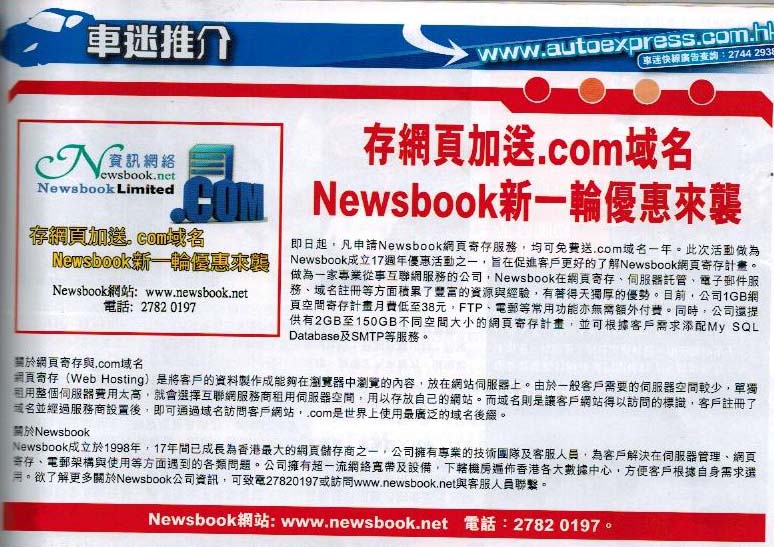 Newsbook自1998年成立以來,一直致力於為客戶提供穩定、快速的網頁寄存、伺服器託管等專業服務,公司擁有一流的網絡設備及專業的技術支援團隊,客戶網站連通率在99%以上,並擁有完善的伺服器安全防護、數據備份等措施,保障客戶所存儲的數據資料安全。做為全港五大商業互聯網供應商之一,Newsbook除網頁儲存外,還提供有網頁設計、伺服器管理、自助網上商店系統、域名註冊、網站推廣等互聯網服務,更多信息可登錄Newsbook網站: www.newsbook.net或致電2782 0197查詢。