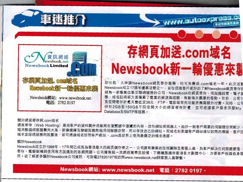 即日起,凡申請Newsbook網頁寄存服務,均可免費送.com域名一年。此次活動做為Newsbook成立17週年優惠活動之一,旨在促進客戶更好的了解Newsbook網頁寄存計畫。做為一家專業從事互聯網服務的公司,Newsbook在網頁寄存、伺服器託管、電子郵件服務、域名註冊等方面積累了豐富的資源與經驗,有著得天獨厚的優勢。目前,公司1GB網頁空間寄存計畫月費低至38元,FTP、電郵等常用功能亦無需額外付費。同時,公司還提供有2GB至150GB不同空間大小的網頁寄存計畫,並可根據客戶需求添配My SQL Database及SMTP等服務。