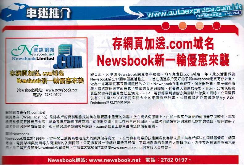 Newsbook十五週年誌慶,免費提升服務加量不加價Newsbook是全港知名的網絡公司之一,為慶賀成立15週年,答謝顧客多年的支持,服務全面提升,Plan48網頁空間由原來的500MB增大到1GB,流量由原來5GB增大到10GB,Plan68網頁空間由原來的1000MB增大到2GB,流量從8GB增大到15GB, Windows平台88NT網頁空間由1000MB增大到3GB,流量也同時增大至20GB,相同的價格,讓你可以享受更多的服務。再配合24 小時技術支援,讓您體驗最可靠、最具經濟效益的互聯網服務。 2013年我們將一如繼往地向客戶提供創新、全面的IT諮詢和幫助客戶更加有效地拓展業務。不要猶豫,立即申請開通服務吧。 想了解更多關於Newsbook的優惠,請登錄Newsbook的網站: www.newsbook.net或致電2782 0197查詢。