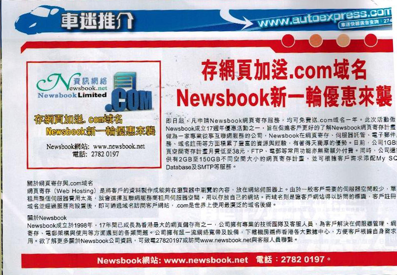 Newsbook自1998年成立以來,一直致力於為客戶提供穩定、快速的網頁寄存、伺服器託管等專業服務,公司擁有一流的網絡設備及專業的技術支援團隊,客戶網站連通率在99%以上,並擁有完善的伺服器安全防護、數據備份等措施,保障客戶所存儲的數據資料安全。做為全港五大商業互聯網供應商之一,Newsbook除網頁儲存外,還提供有網頁設計、伺服器管理、自助網上商店系統、域名註冊、網站推廣等互聯網服務,更多信息可登錄Newsbook網站: www.newsbook.net或致電2782 0197查詢。 |