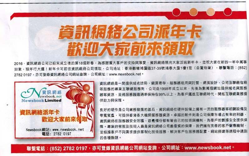 Newsbook是全港知名的網絡公司之一,為慶賀成立15週年,答謝顧客多年的支持,服務全面提升,Plan48網頁空間由原來的500MB增大到1GB,流量由原來5GB增大到10GB,Plan68網頁空間由原來的1000MB增大到2GB,流量從8GB增大到15GB, Windows平臺88NT網頁空間由1000MB增大到3GB,流量也同時增大至20GB,相同的價格,讓你可以享受更多的服務。再配合 24 小時技術支援,讓您體驗最可靠、最具經濟效益的互聯網服務。2013年我們將一如繼往地向客戶提供創新、全面的IT諮詢和幫助客戶更加有效地拓展業務。不要猶豫,立即申請開通服務吧。