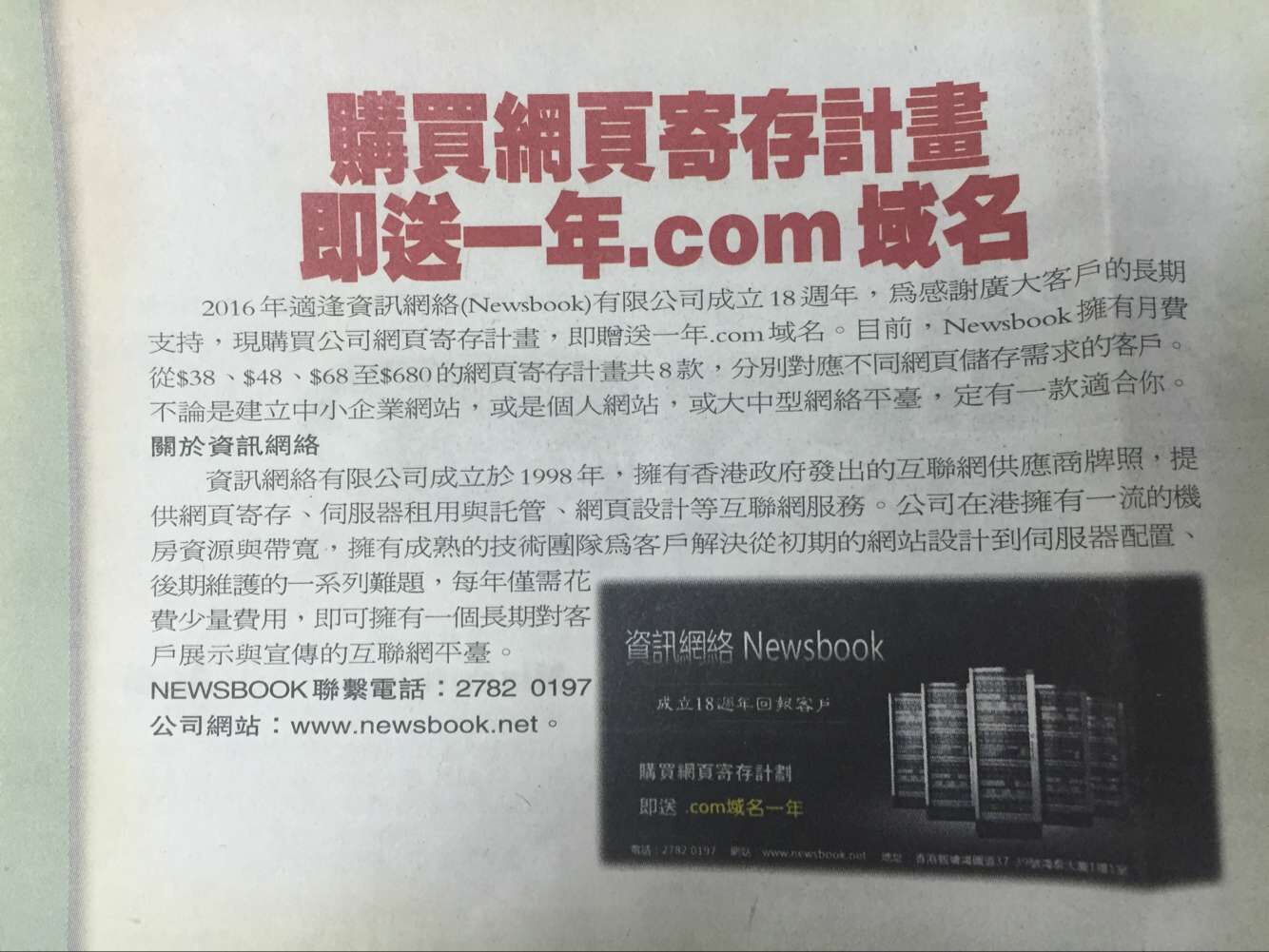 2016年適逢資訊網絡(Newsbook)有限公司成立18週年,為感謝廣大客戶的長期支持,現購買公司網頁寄存計畫,即贈送一年.com域名。目前,Newsbook擁有月費從$38、$48、$68至$680的網頁寄存計畫共8款,分別對應不同網頁儲存需求的客戶。不論是建立中小企業網站,抑或是個人網站,或大中型網絡平臺,定有一款適合你。
