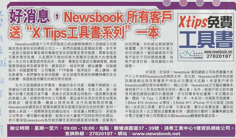 關於Newsbook的服務詳情,請登錄Newsbook的網站: www.newsbook.net或致電2782 0197查詢。