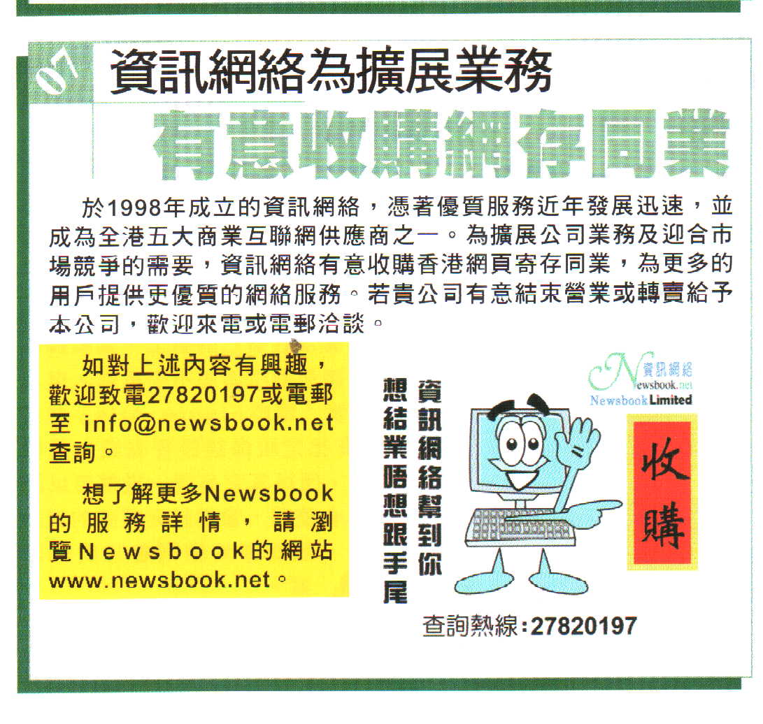In order to expand business and meet the needs of market competition, Newsbook Limited intends to take over Hong Kong web hosting industry for more users to provide better network services. If your company intends to close down or sell the Company to grant, please call or e-mail to negotiate.