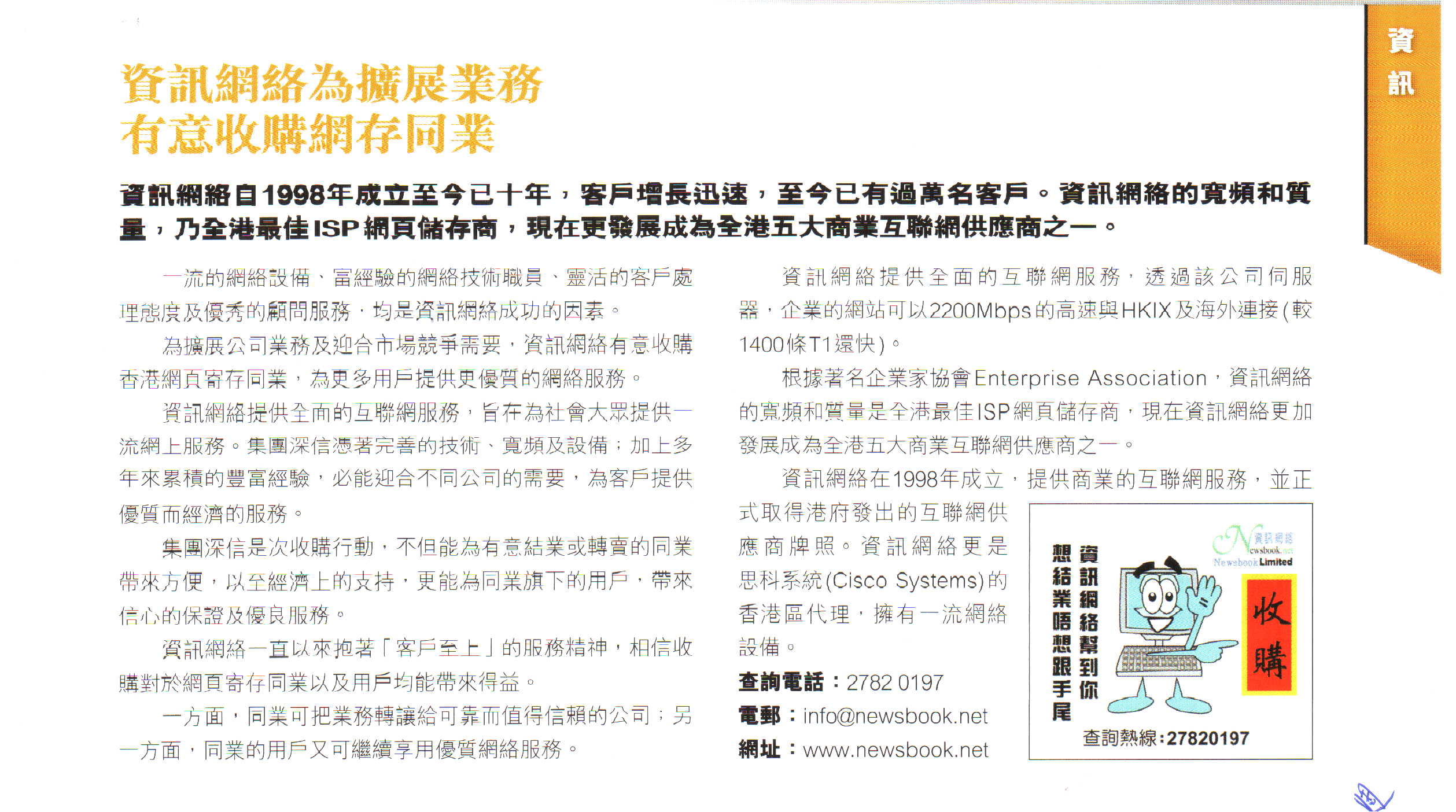In order to expand business and meet the needs of market competition, Newsbook Limited intends to take over Hong Kong web hosting industry for more users to provide better network services. If your company intends to close down or sell the Company to grant, please call or e-mail to negotiate.