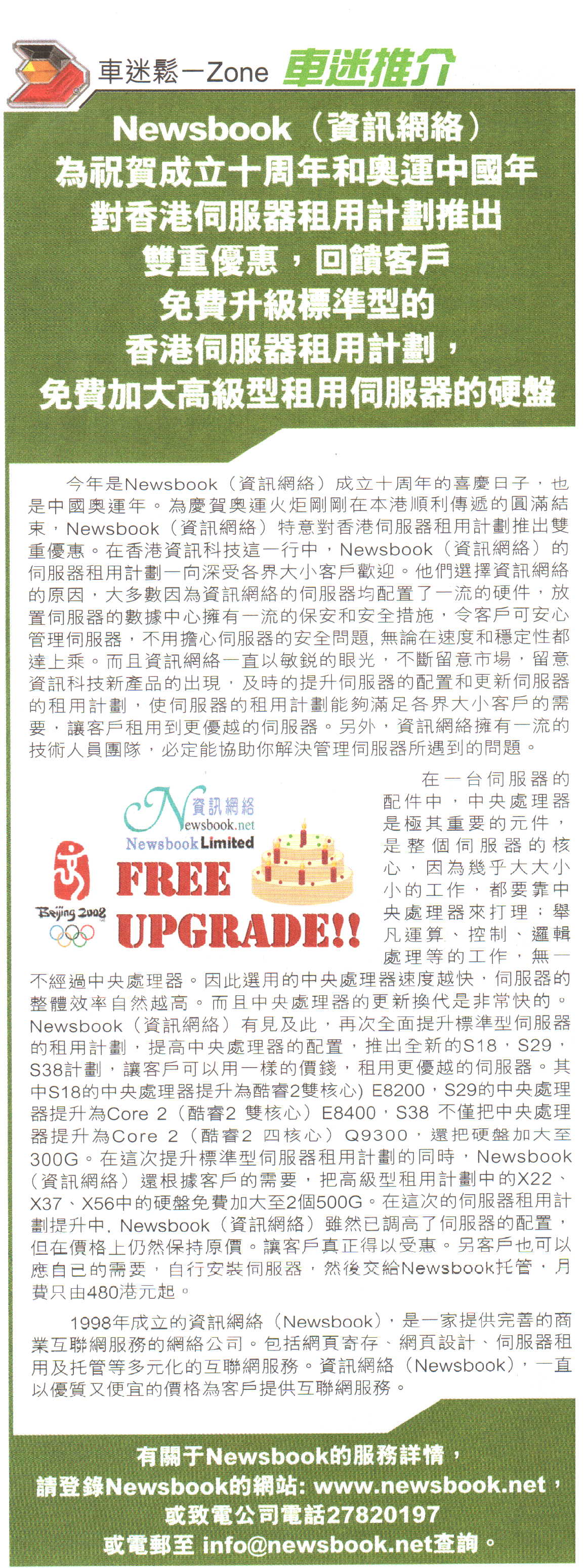 Newsbook provide double special offer of Hong Kong server rental and co-location for 10th anniversary and China Olympia year. For reward clients, free upgrade plan of standard HK server rental and collocation and plan of Xeon HK server rental and collocation (Enlarge the harddisk)