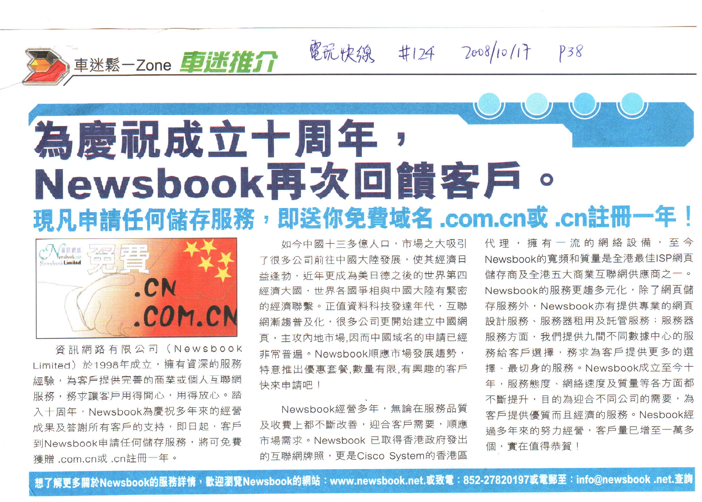 Newsbook limited Co., Ltd. (Newsbook Limited) was established in 1998. We have experience in senior services to provide clients with comprehensive commercial and personal Internet services. To enable customers using happily, set your heart at ease. The tenth anniversary, Newsbook to celebrate the many years of operating results and thankful for the support of all customers, with immediate effect, the customer apply for any Newsbook storage services will be offered a free registration of . Com.cn or. Cn a year.