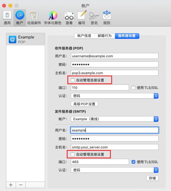 填写寄件服务器中的"用户名"为密码纸的smtp帐户,重新输入smtp密码,取消勾选"自动管理连线设置",连接埠为465,认证方式为密码