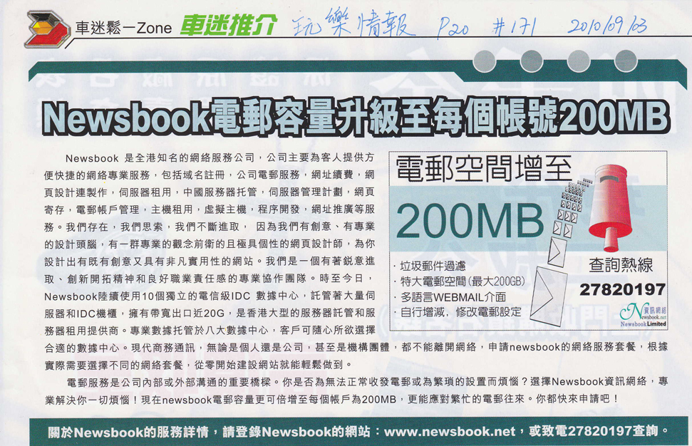 电邮服务是公司内部或外部沟通的重要桥梁? 你是否为无法正常收发电邮或为繁琐的设置而烦恼? 选择Newsbook资讯网络, 专业解决你一切烦恼! 现在newsbook 电邮容量更可倍增至每个帐户为200MB, 更能应对繁忙的电邮往来?