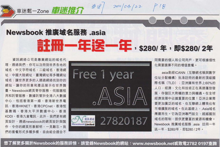 asia是ICANN(互联网名称与数字位址分配机构)批准注册的最新的顶级国际名称(TLD); 亚洲拥有世界上60%的人口, 经济、文化和技术正在高速蓬勃发展, 存储巨大商机的潜力与机遇。在全球经济浪潮中占据重要的位置! 亚洲企业需要更加广泛的域名。在此基础上, .Asia域名应运而生。它为亚洲专门设立, 超越国别域名的限制, 提供更丰富的资源和机会。Newsbook推广域名服务.asia注册一年送一年, $280/年, 即$280/2年。