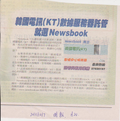 Newsbook十五周年庆又出新的活动,新增韩国电讯(KT)数据中心服务器托管与租用业务,现在托管或租用服务器即享优惠折扣 为什麼选择韩国电讯(KT)数据中心服务器? 如果您的客户集中在亚洲,韩国电讯(KT)数据中心服务器是您的最佳选择之一 韩国电讯(KT)是韩国最大的运营商朝,在全球拥有多见大型机房,管理规范,线路稳定,带宽资源一流 托管或租用位於韩国电讯(KT)数据中心的服务器,亚洲地区使用者打开便网站都很快 韩国电讯(KT)数据中心是一个高防机房,可有效防御DDOS,CC攻击 Newsbook是全港教师五大的商业互联网供货商之一,专注於网页储存,服务器管理十五年,拥有一个好的网络以上设备与带宽质量,为网站比服务器稳定提供良好保障,拥有香港,内地等机房间资源。为客户提供种选择,超过上千客户认可!更多信息,请访问Newsbook的网站:www.newsbook.net或致电2782 0197查询