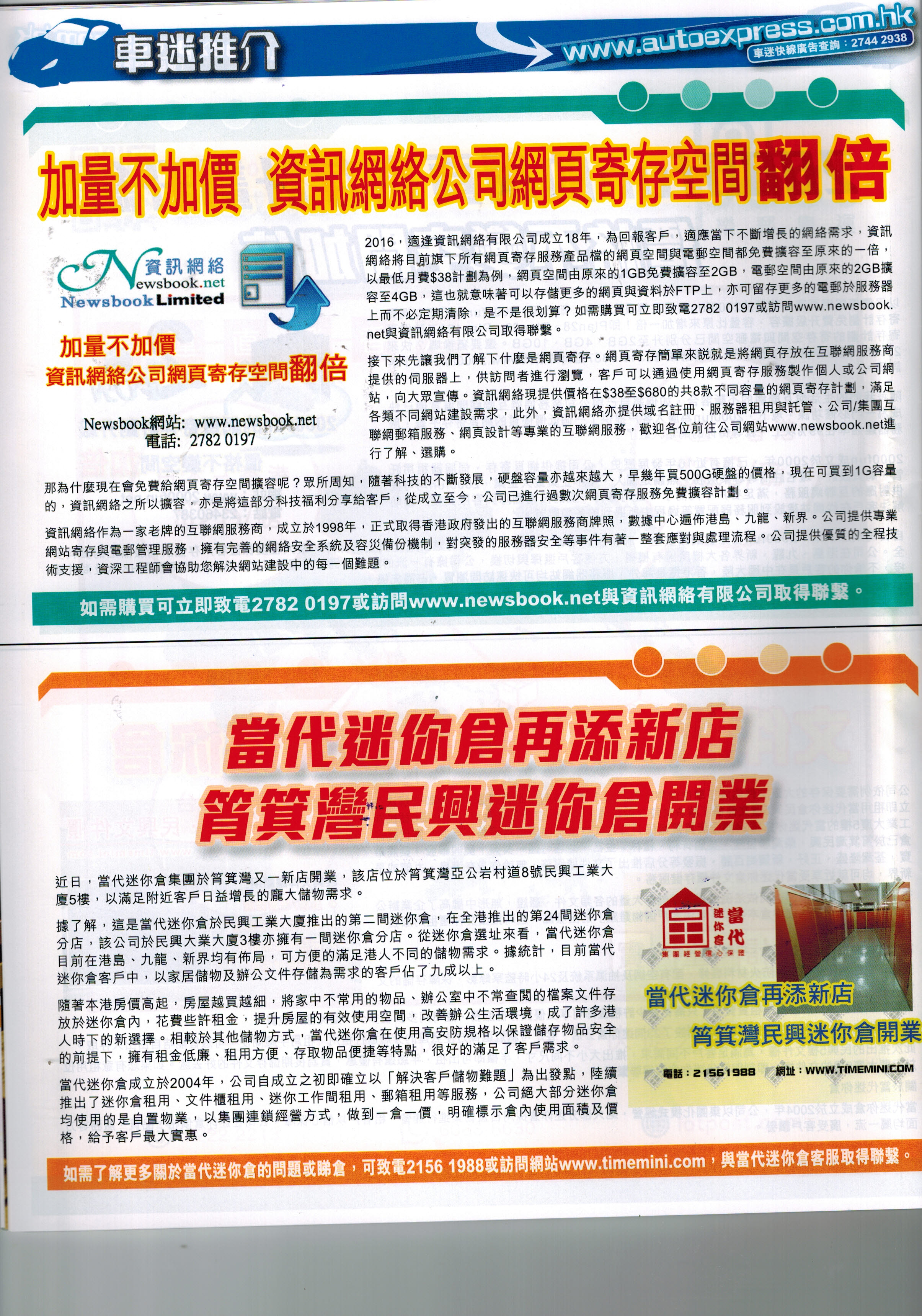2016,适逢信息网络有限公司成立18年,为回报客户,适应当下不断增长的网络需求,信息网络将目前旗下所有网页寄存服务产品文件的网页空间与电邮空间都免费扩容至原来的一倍,以最低月费$38计划为例,网页空间由原来的1GB免费扩容至2GB,电邮空间由原来的2GB扩容至4GB,这也就意味着可以存储更多的网页与数据于FTP上,亦可留存更多的电邮于服务器上而不必定期清除,是不是很划算?如需购买可立即致电2782 0197或访问www.newsbook.net与信息网络有限公司取得联系。